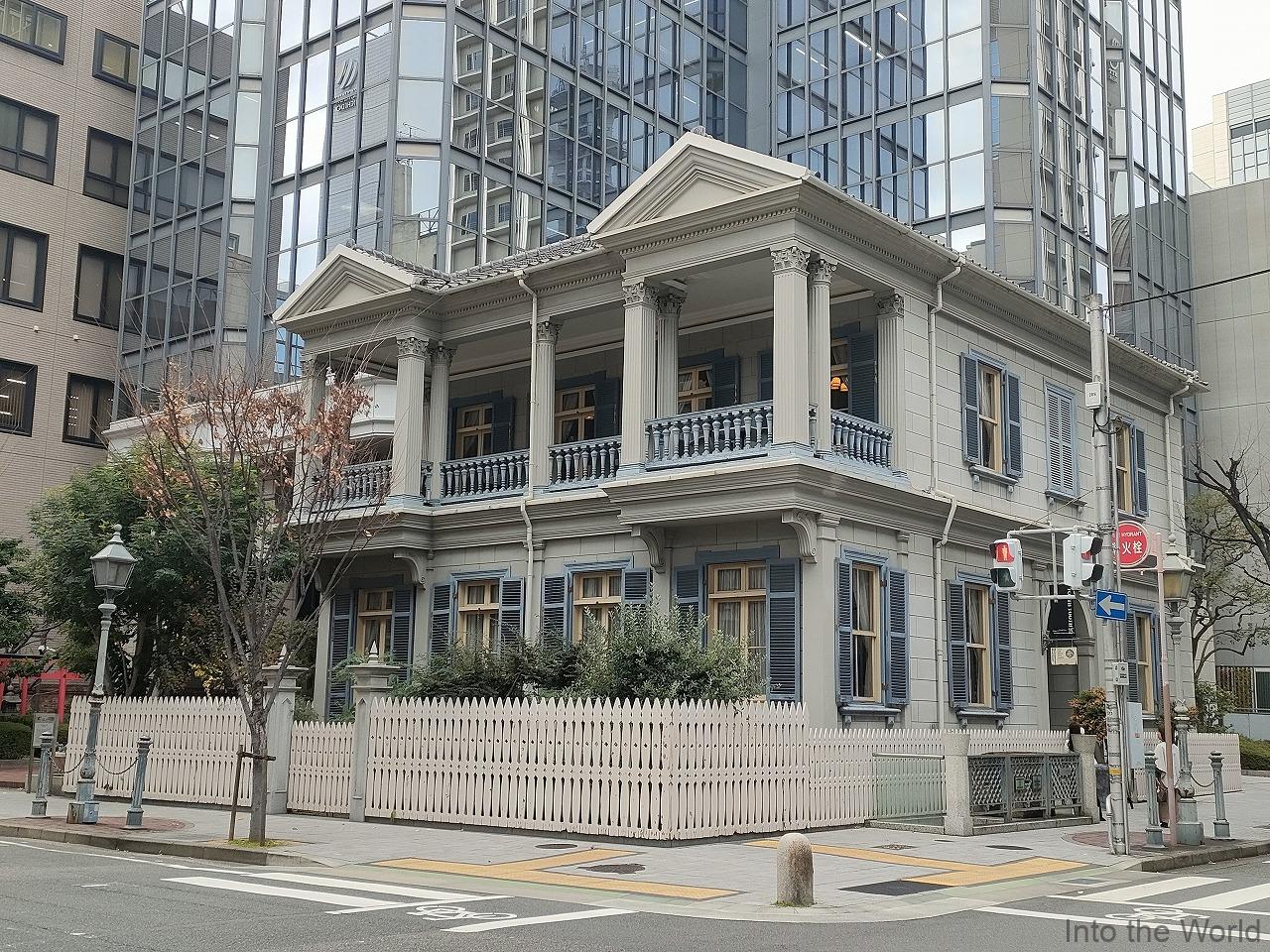 街角に佇む洋館は、周囲の高層ビル群に囲まれながらも独自の存在感を放っています。