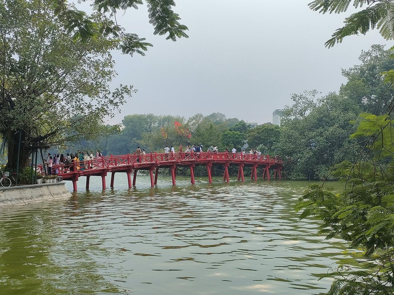 湖の周囲には、赤い橋で結ばれたゴックソン祠(玉山祠)や、小島に立つ亀の塔があり、歴史と文化を感じさせるスポットが点在しています。