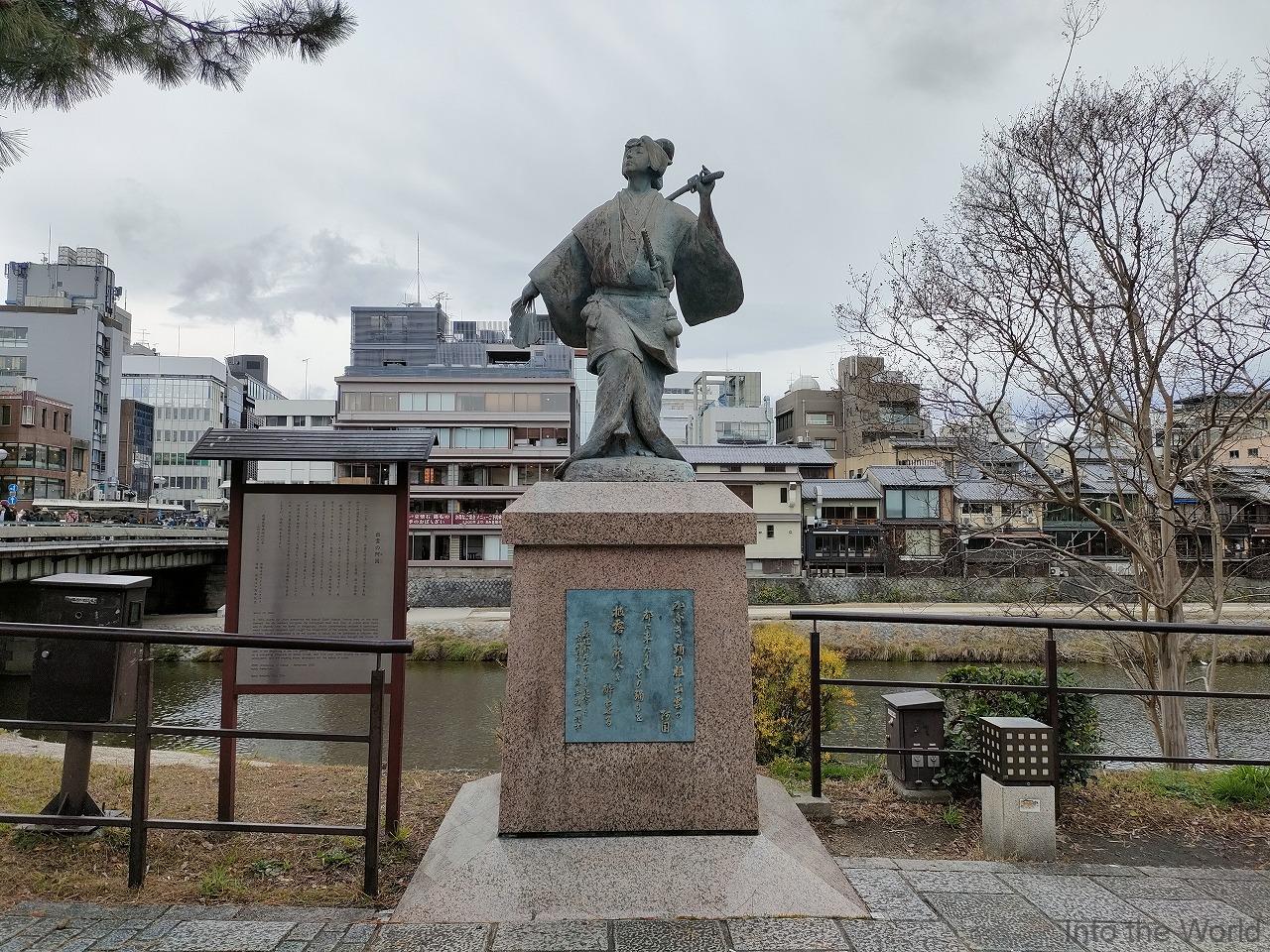銅像がこの場所にあるのは、慶長8年(1603年)に、出雲の阿国が鴨川の四条河原でかぶき踊りを披露し、この辺り一帯が歌舞伎発祥の地とされているためです。