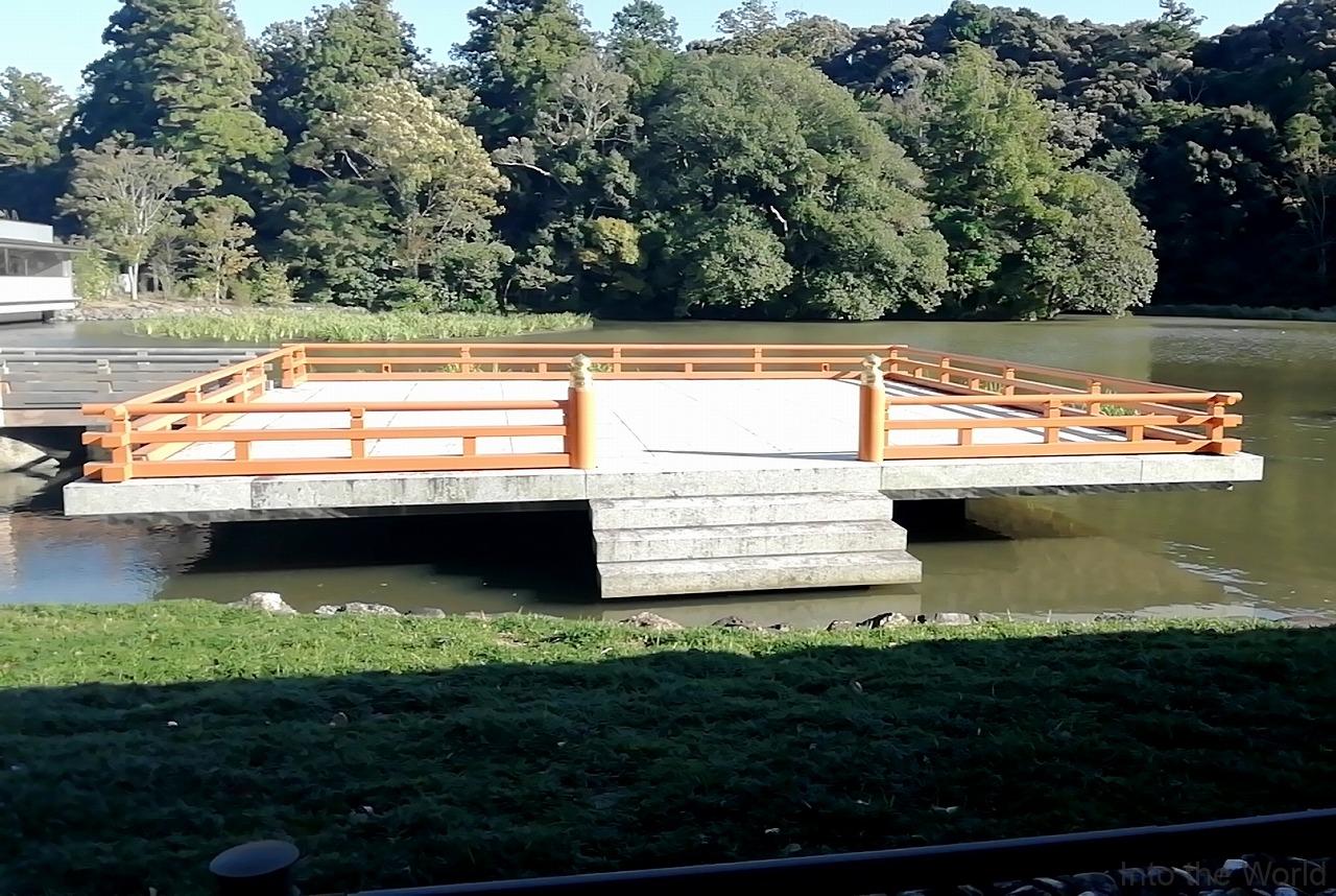 せんぐう館脇の勾玉池には奉納舞台が浮かんでいます。